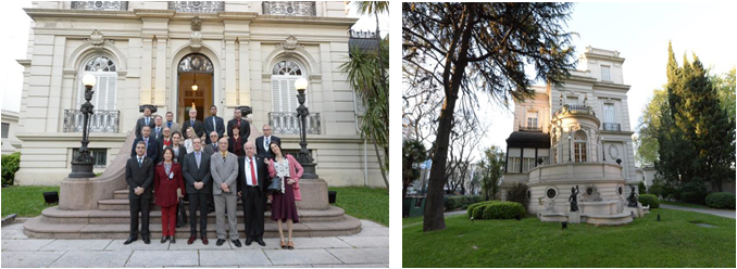 Terminada esta fase. A comitiva dirigiu-se a residência oficial do embaixador onde a comitiva foi recebida pelo próprio Sr. Embaixador Hadil Fontes da Rocha Viana. Diplomata de carreira do Ministério das Relações Exteriores, com larga experiência internacional, com sua sabedoria teceu comentários interessantes sobre integração entre Brasil e Uruguai. Presente se fazia o General (R) Don Montaldo, Diretor do CALEN, que fora convidado pelo nosso anfitrião, bem como os adidos militares e o cultural brasileiro. Foi-nos dada a oportunidade de conhecer a residência, que é um prédio centenário e conhecido como ―Palácio Pietracaprina. Sua construção foi concluída no ano de 1913. E ela é uma referência arquitetônica da cidade. Já no seu interior, nosso país se faz presente por uma série de obras de arte e de decoração, que valorizam ainda mais o lugar.