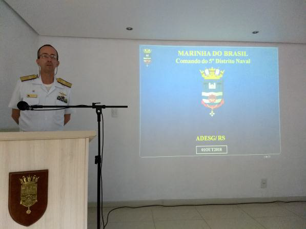 Na sequência a delegação se dirigiu a sede do Comando do 5º Distrito Naval, localizado entre o Porto Velho e o Porto Novo da cidade de Rio Grande. Lá foram recebidos inicialmente pelo Chefe do Estado-Maior, Capitão de Mar-e-Guerra (CMG) TROVÃO. Que direcionou o grupo a um pequeno auditório, no qual aguardamos a chegada do comandante do 5º DN, Vice-Almirante JOSÉ RENATO de Oliveira. Neste local o almirante JOSÉ RENATO falou sobre a importância da Marinha para garantir a segurança da navegação. Um conceito que engloba não só a parte militar, como também a navegação comercial, a navegação de esporte e lazer e a atividade portuária. Em tarefas que são distribuídas pela maior parte das 20 organizações militares subordinadas a este comando.