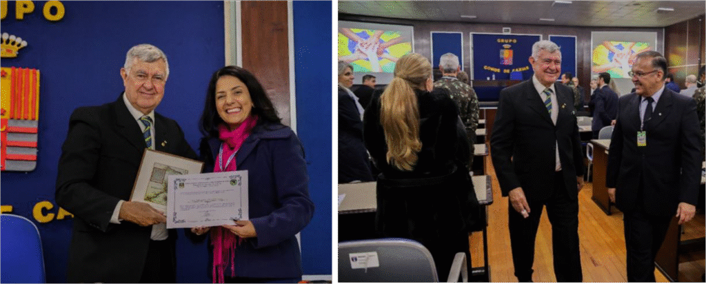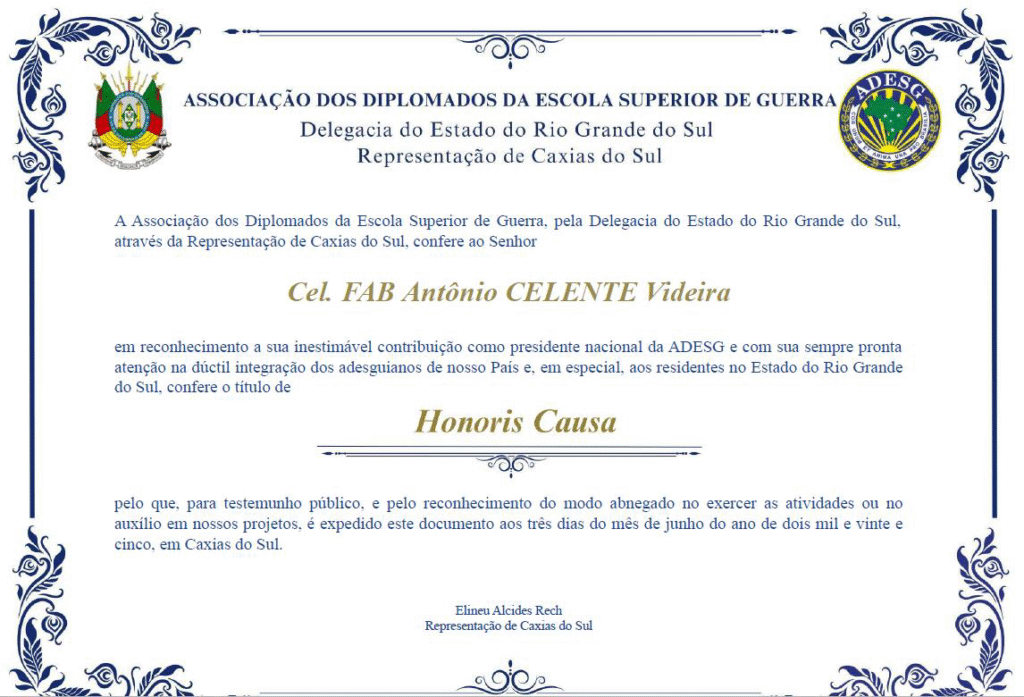 Na ocasião da Aula Magna, a Executiva da Representação de Caxias do Sul da ADESG-RS agraciou Presidente Nacional da ADESG, Cel. CELENTE com o Título de “Honoris Causa”, acompanhado de um SABRE personalizado.