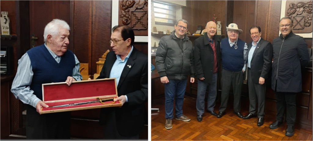 Na ocasião, Representante da Representação, Sr. Elineu Rech, o Sr. Sergio Corti Ribeiro, Representante Adjunto, Sr. Edegar Lopes, Coordenador do CEPE 2025 e o Adesguiano Leonardo Roth, realizaram a entrega da distinção, bem como um chapéu, carteira personalizada da ADESG, pin da ADESG e um diploma.