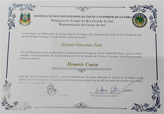Ainda no mês de junho, a Representação de Caxias do Sul, homenageou o Sr. Edemir Giacomo Zatti, Adesguiano ativo desde o ano de 1966, primeiro CEPE de Caxias do Sul, que teve a participação de 176 estagiários com o título de “Honoris Causa”. Essa honraria que seria entregue pelo Presidente Nacional, Cel. CELENTE em sua passagem por Caxias, não foi possível em função de problemas de saúde familiar do Sr. Zatti.