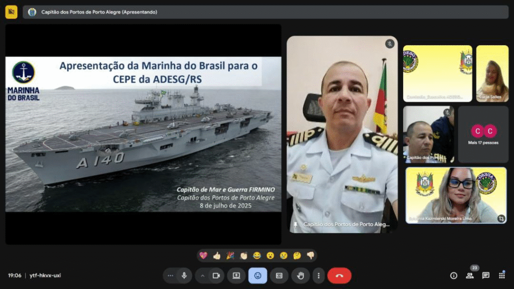 No dia 08 de julho, sobre “A Marinha do Brasil – Capitania dos Portos de Porto Alegre – Missão e Atribuições”, com o CMG Flávio Firmino dos Santos, Capitão dos Portos da Capitania Fluvial de Porto Alegre.