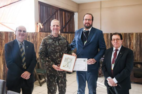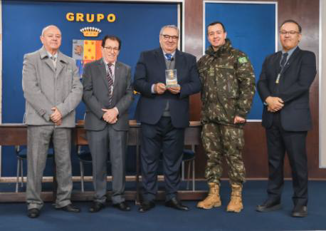 O Comandante também foi agraciado com um exemplar do livro “O Quartel”, alusivo aos 75 anos do 3º GAAAe – Grupo Conde de Caxias e também um exemplar para a biblioteca do Batalhão, oferecido pela Representação de Caxias do Sul através do Sr. Elineu Rech e entregue pelo Escritor e Adesguiano Sr. Juarez NUNES da Silva.