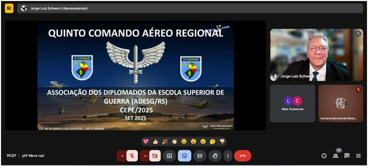 No dia 10 Set, sobre o tema “Atribuições da FAB e do V COMAR para atender a Estratégia Nacional de Defesa” com o Cel Av Res Jorge Luiz Schwerz, do Estado Maior do V COMAR.